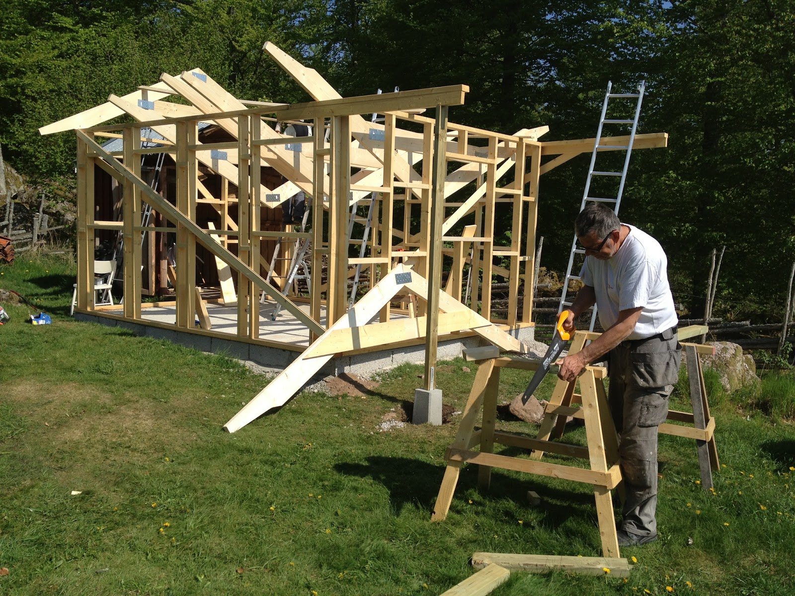 Takstolen på bilden är den mall som använts för de andra takstolarna som Ronnie sågat till hemma!